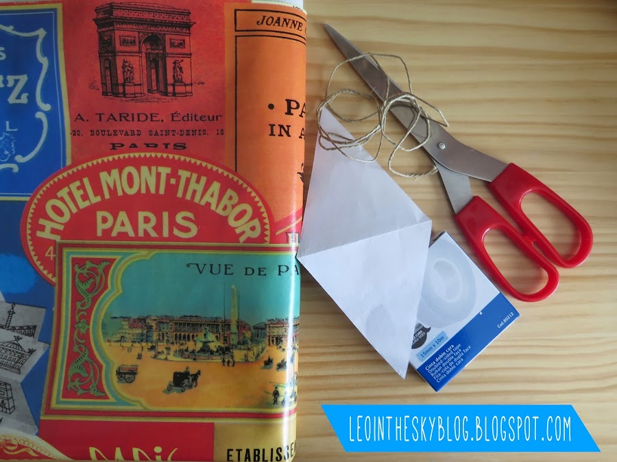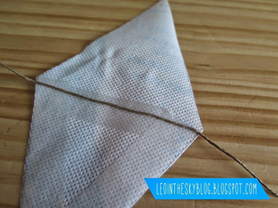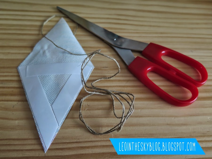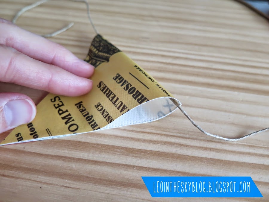 Por último se recortan los bordes sobrantes para dejar el triángulo perfecto y ya tendríamos el primer banderín de nuestra guirnalda. Haríamos lo mismo con tantos banderines como quisiéramos dejando cuerda a ambos lados de la guirnalda para poder atarla/pegarla a la pared. ¡Ya está lista para colgar!