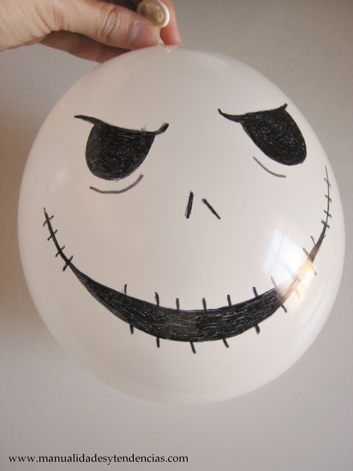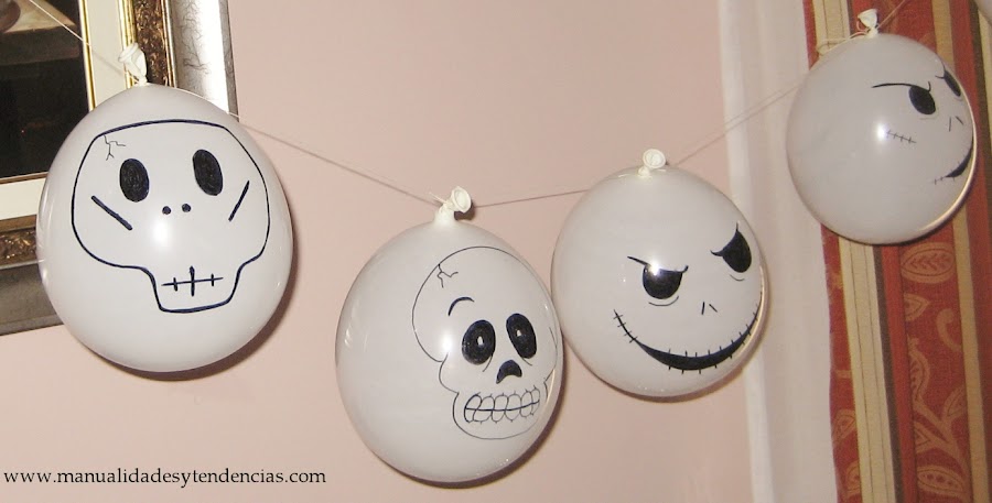 Para hacer esta "guirnalda terrorífica" sólo necesitaréis globos blancos, cuerda y un rotulador negro. Dibujaremos caras de monstruos y calaveras, yo os dejo unos ejemplos facilitos pensados para que cualquier niño pueda realizarlos. Ahora sólo queda atar los globos con una cuerda y ¡listo para colgar!