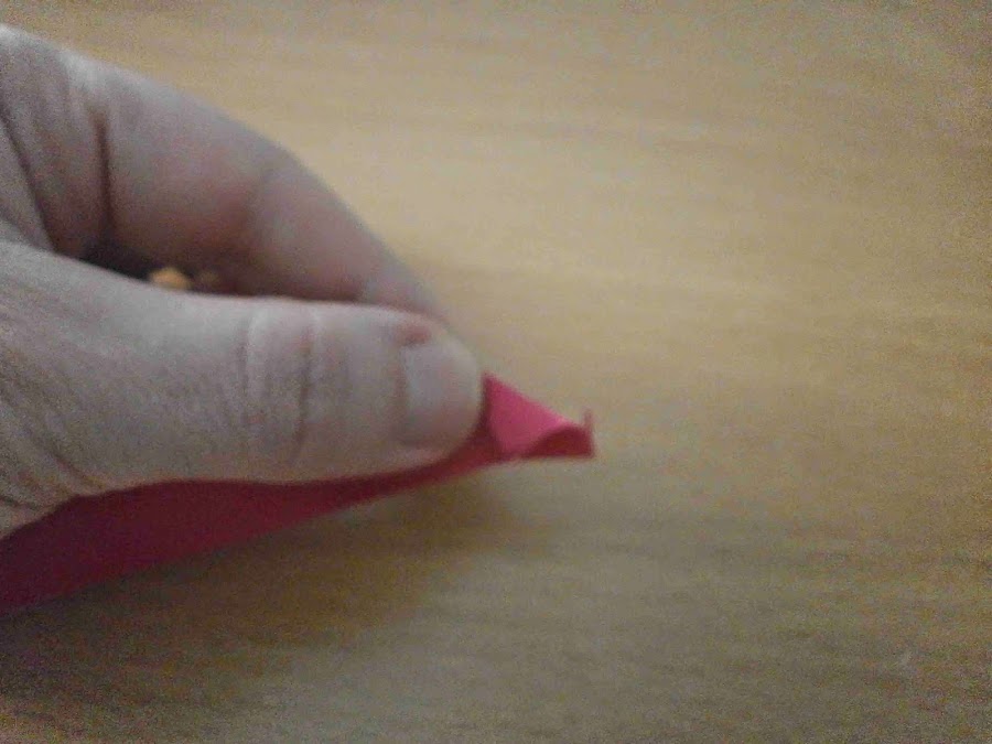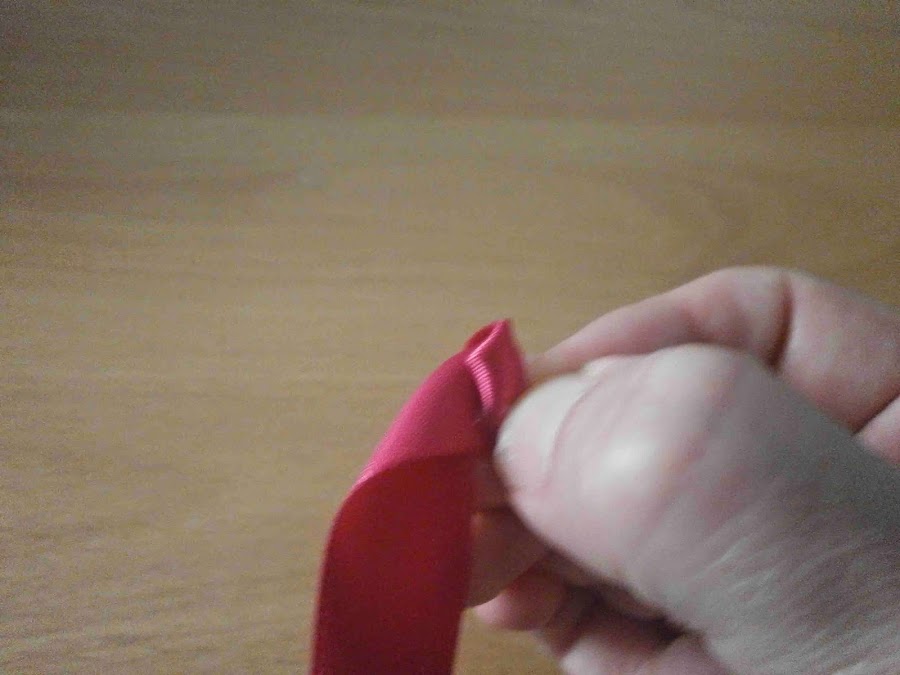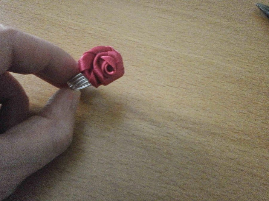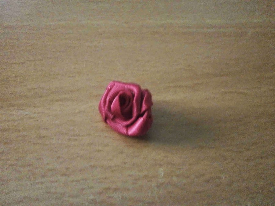 Luego hice la rosa con un trozo de cinta de raso. Doblé una esquina y enrollé un trocito pegando con silicona.