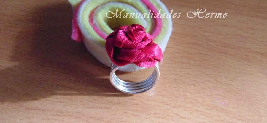 Hoy os traigo este anillo de aluminio con una rosa hecha con cinta de raso.