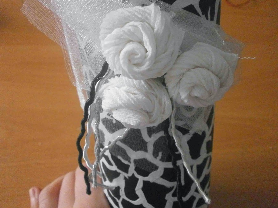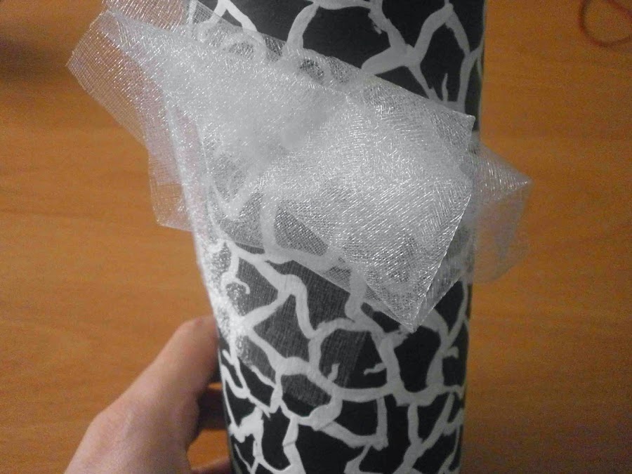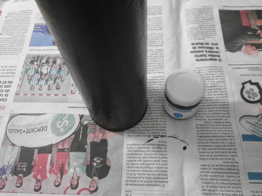 Materiales: Un bote de patatas fritas, pintura acrílica negra y blanca, pincel, tela, silicona, cuerda, strass adhesivo.