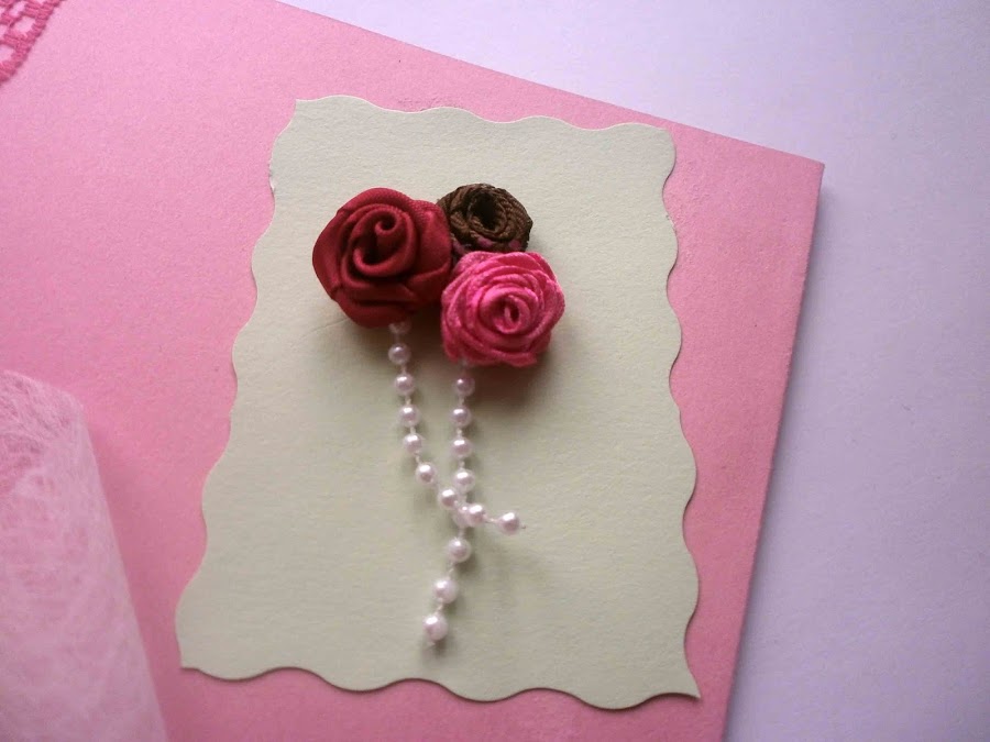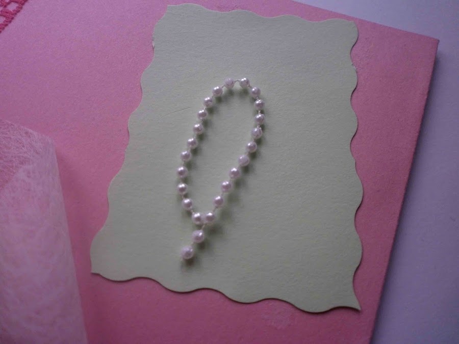 Pegué el trozo de cartulina en el sobre y le pegué el cordón de perlitas y encima las flores mas un lacito.