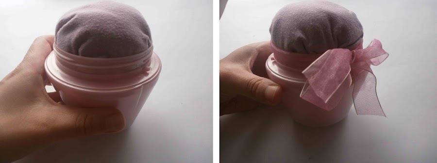 Materiales: Un tarro vacío, tela, algodón, goma, botones, lazo, pegamento instantáneo ( fuerte).