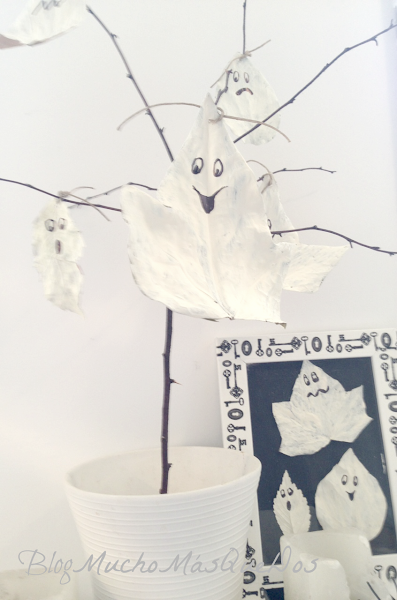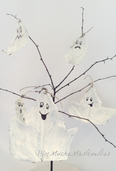 Buscas una rama, una maceta y cuelgas con cordón natural los fantasmas. Más simple, imposible!