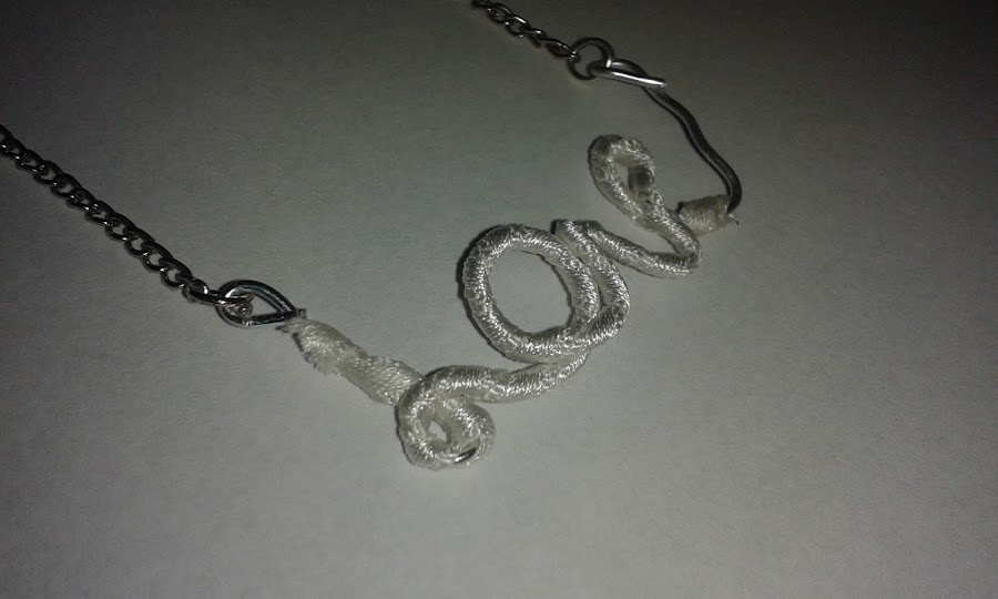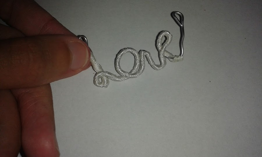 2º En segundo lugar con el trozo de alambre que tienes debes ir moldeándolo con las manos; si el alambre es maleable o con un alicate si es mas rígido, hasta darle la forma adecuada, en mi caso decidí hacer la palabra; Love. También puedes hacer tu nombre o cualquier símbolo que te identifique. Recuerda moldear a cada extremo dos "enganches" donde poder unir el alambre con la cadena.