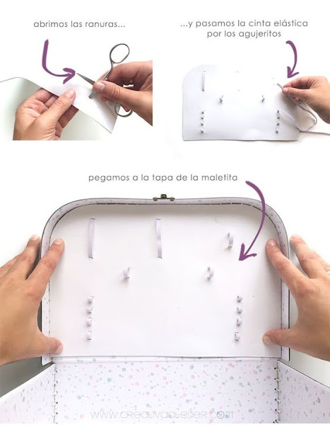 Con la punta de unas tijeras haremos unos agujeros en esos puntos para pasar posteriormente las gomas elásticas que habremos cortado también con el tamaño deseado. Con el pegamento aseguraremos las cintas elásticas en la plancha de goma eva.