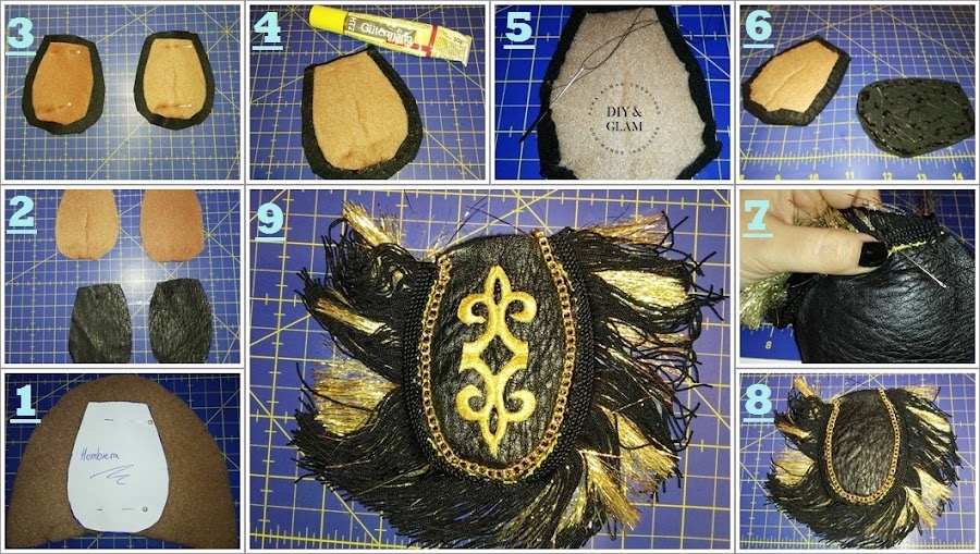 Pegar el adorno en el centro de la hombrera. Y ya tenemos listas nuestras hombreras decorativas con flecos!!!