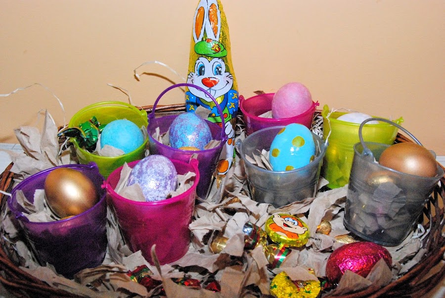 Huevos de chocolate, chocolatinas y en cada cesta un huevo.