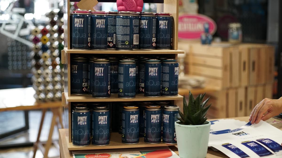 Como podéis ver en la foto, además creamos unas estanterías con botes de spray en las que se exponían diversos objetos pintados, sobre todo con AQUA, la nueva gama de pinturas de Novasol Spray.