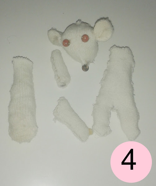 En cuarto lugar, rellenad las distintas partes del peluche con algodón, o aquello que vayáis a utilizar para rellenar. Yo usé dos abalorios como ojos y uno como nariz y los cosí en la que seria la cabeza de mi peluche.