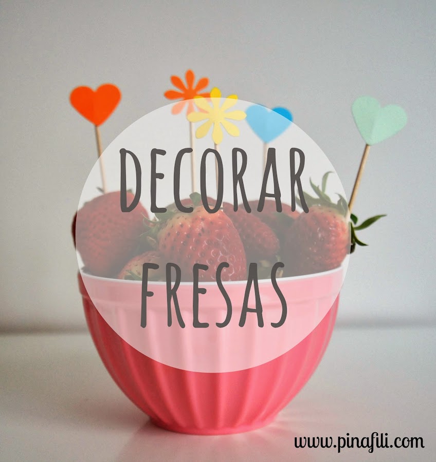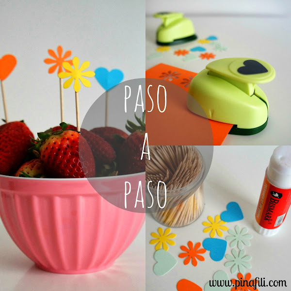 Empezamos troquelando o recortando las cartulinas, en mi caso flores y corazones. Cuando tengamos suficientes, añadimos pegamento en una de las partes y lo pegamos al palillo, así de fácil, no hay más. Terminamos poniendo las banderillas, en mi caso, sobre las fresas.