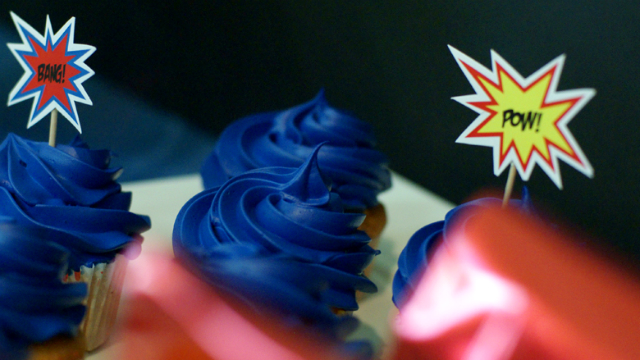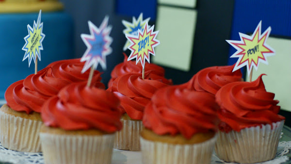 A los cupcakes solo les agregue toppers con acciones de superhéroes, así que esta idea puede servir para cualquier otra fiesta no solo la de Superman. Esos también son fáciles de hacer uno mismo, en esa ocasión los compré con Cherry Berry pero pueden encontrar buenas opciones en Pinterest si desean imprimirlos en casa.