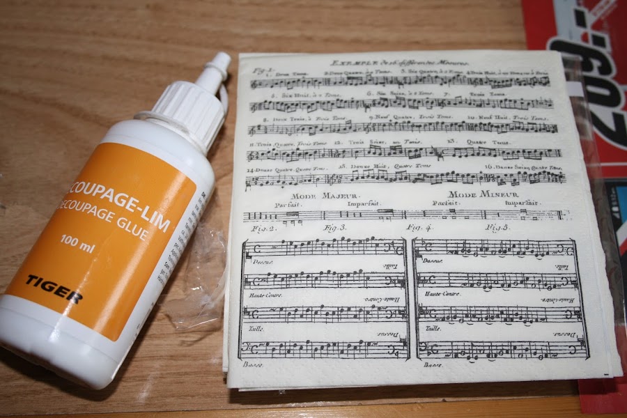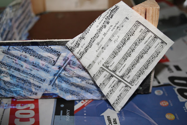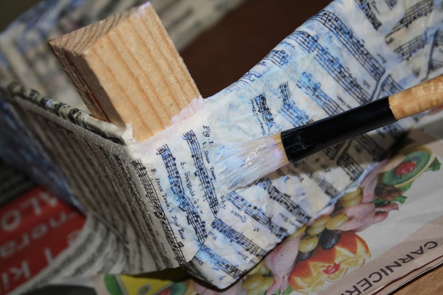 Después de limpiar bien la caja, vamos pegando el papel de la servilleta por todo el exterior.