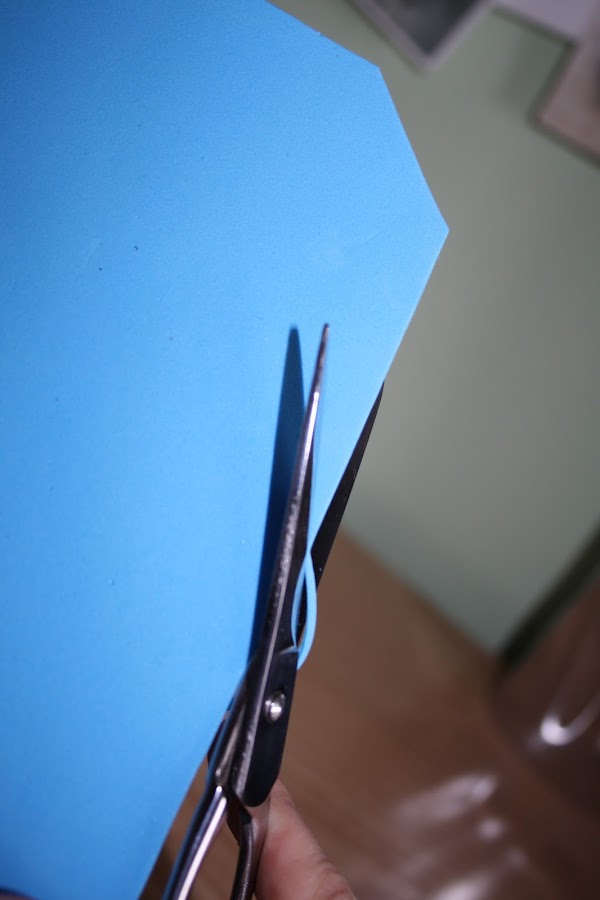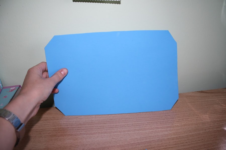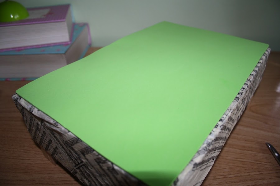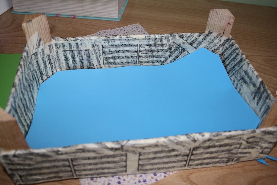 Ahora lo siguiente es dar la vuelta a la caja y ponerla boca abajo, coger una lámina de goma eva y medirla sobre el fondo como vemos en las fotos.