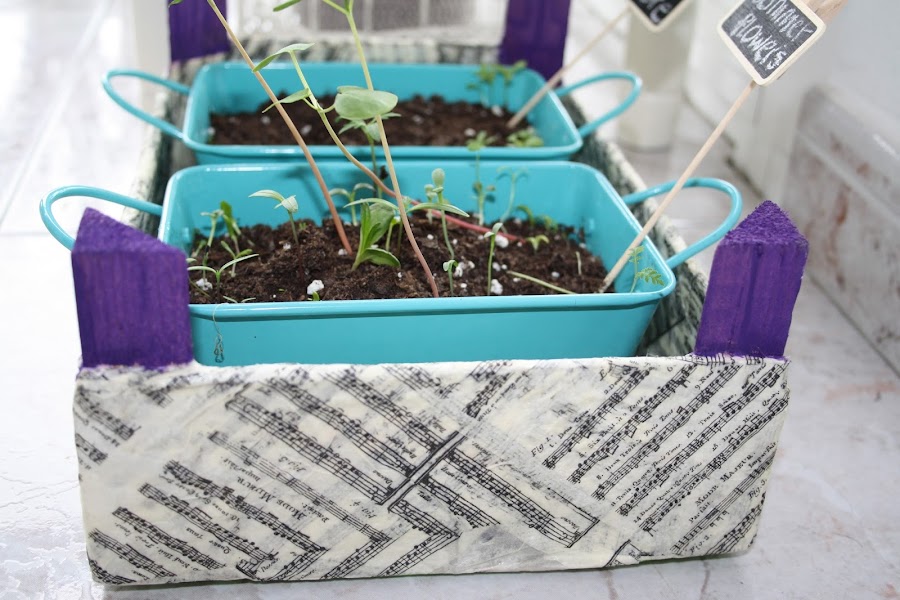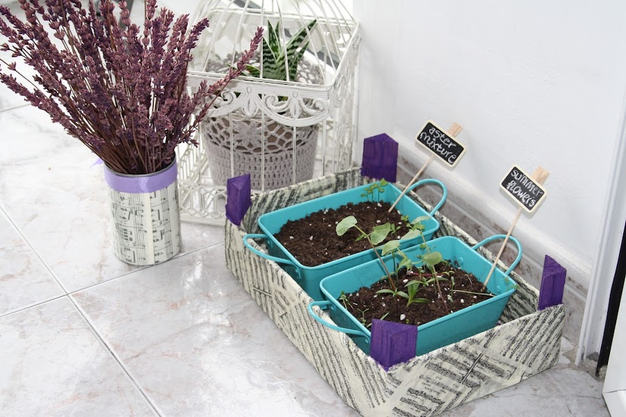 Se me ocurrió que reciclando una caja de fresas y metiéndole un par de jardineras pequeñas dentro, me daría esa satisfacción (aunque no se parezca nada a las fotos idílicas de cualquier revista de decoración actual).