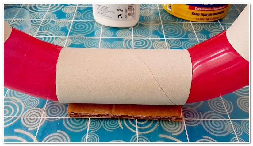 Ya inflado el globo y con ayuda de unos tubos de papel higienico le di la forma y los rectángulos de cartón me sirvieron de base para el jarrón a estos los envolví en cinta de carrocero y ya estamos listos para poder trabajar sin temor a que se caiga.