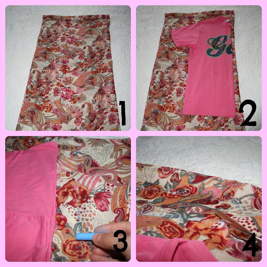 Colocamos la camiseta a la mitad sobre el pañuelo. El objetivo es que la camiseta nos "indique" el patrón de nuestro kimono.