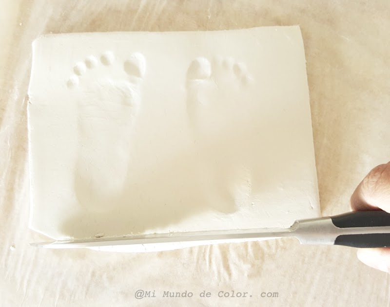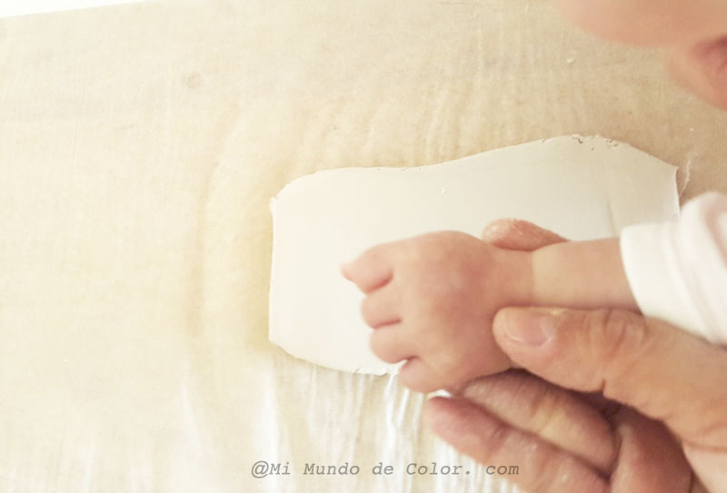 2. En la superficie plana pon una hoja de papel vegetal y allí la masa. "No dejes pasar mucho tiempo", ya que la masa estará más o menos blanda; Condición perfecta para posicionar la huella del bebé sin hacer mucha presión y correr el riesgo de lastimarle.