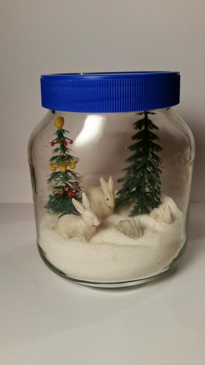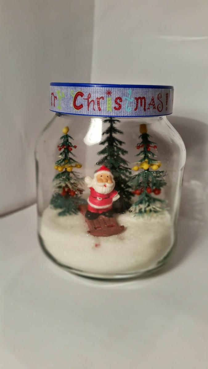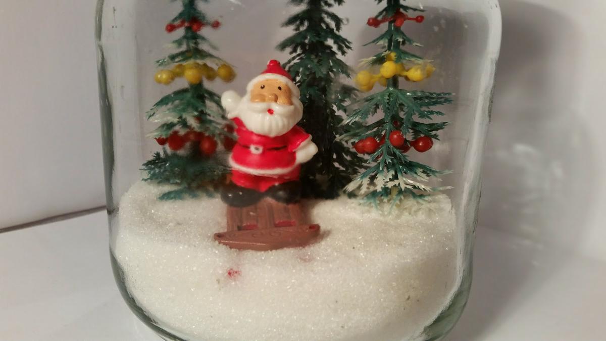 Es tan sencillo como meter azúcar en un bote simulando la nieve y colocar algunas figuritas de Navidad.