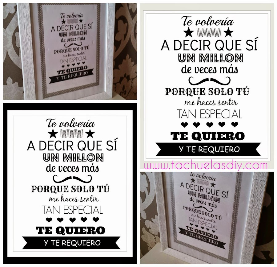 Pues quizás la solución es más fácil de lo que pensamos,tampoco hay que gastarse un pastón para demostrar nuestro amor ,aunque se venden por 30 â?¬ láminas con frases como esta,pero con simplemente dedicar nuestro valioso tiempo con nuestras manos ,además de ahorrarte ese dinero ,él lo valorará muchísimo.