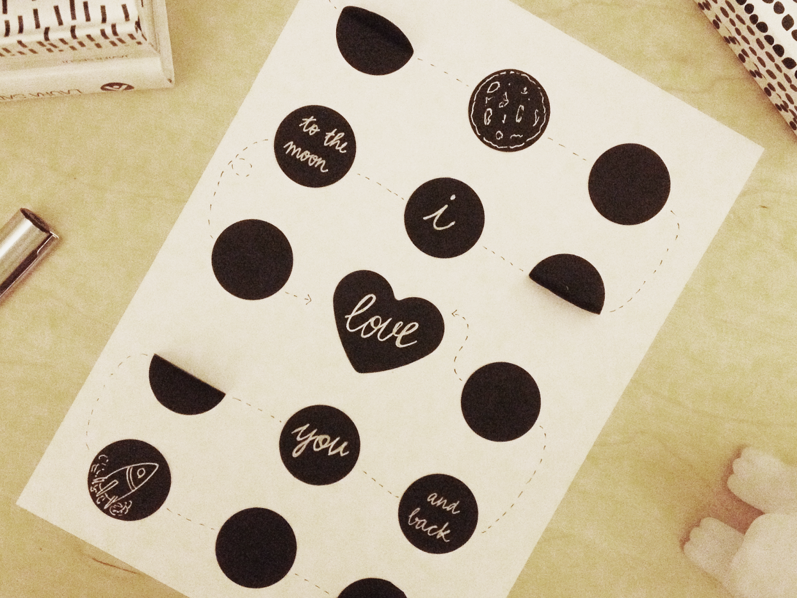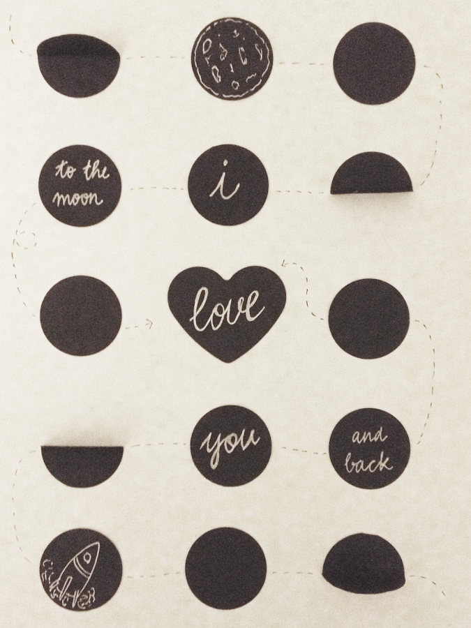Como podéis ver, he puesto un corazón en el centro para que rompiera un poco la monotonía de la lámina. He dibujado entre ls diferentes circulitos la frase que os decía al principio y además una luna y un cohete. Y todo ello unido por unas líneas de puntitos para que parezca como que se va de un punto a otro.