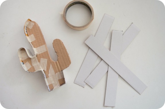 Ahora coge el cactus del cartón y vete poniéndole estas tiras por todo el perímetro, justo por la mitad de las mismas para que quede centrado, ayudándote de la cinta de carrocero.