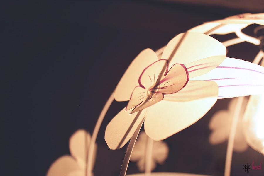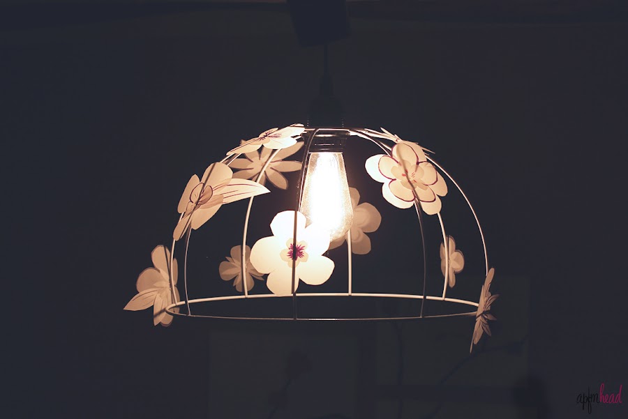 Nos quedamos con el esqueleto y necesitábamos papel vegetal para crear unas florecillas con las que decorar la lámpara. Con rotulador sobre el papel dibujamos algunas flores y hojas sencillas y las cortamos. Con la pistola de pegamento caliente pegamos algunas flores y hojas creando flore de varias capas y les damos un poco de volumen doblando los pétalos. A la estructura de la lámpara las pegamos con el mismo pegamento.