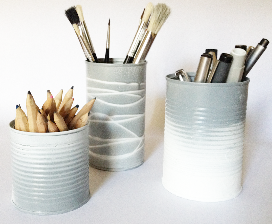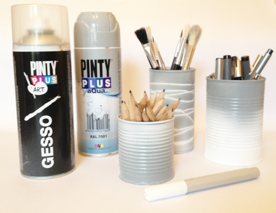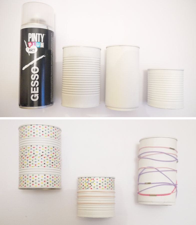 - pintamos las latas con una capa de spray gesso, tanto por fuera como por dentro, y dejamos secar