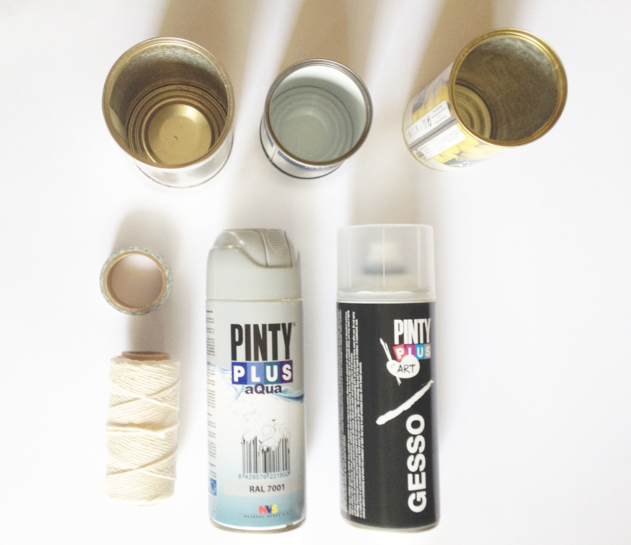 Lo que vamos a necesitar es: latas de conservas, pintura en spray, washitape y cordón o algo finito para marcar las latas.