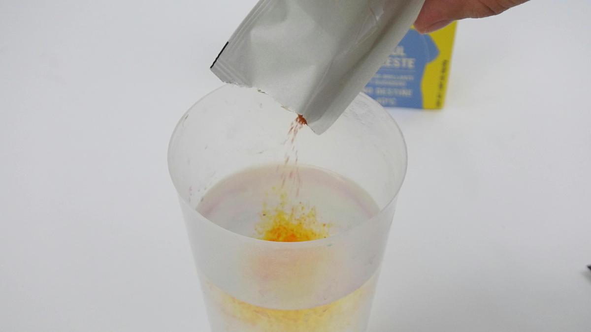 A continuación preparamos el color. Lo normal es tomar un sobre de tinte y verterlo en un vaso con agua caliente. Entonces, removemos bien para que el tinte se diluya.