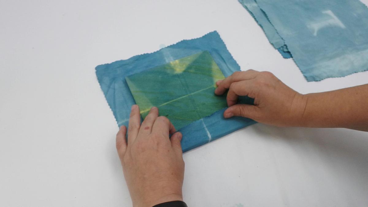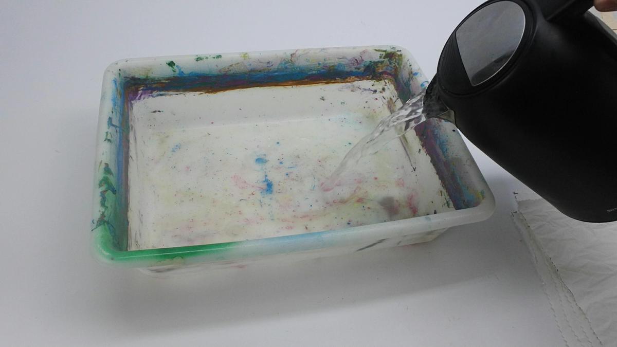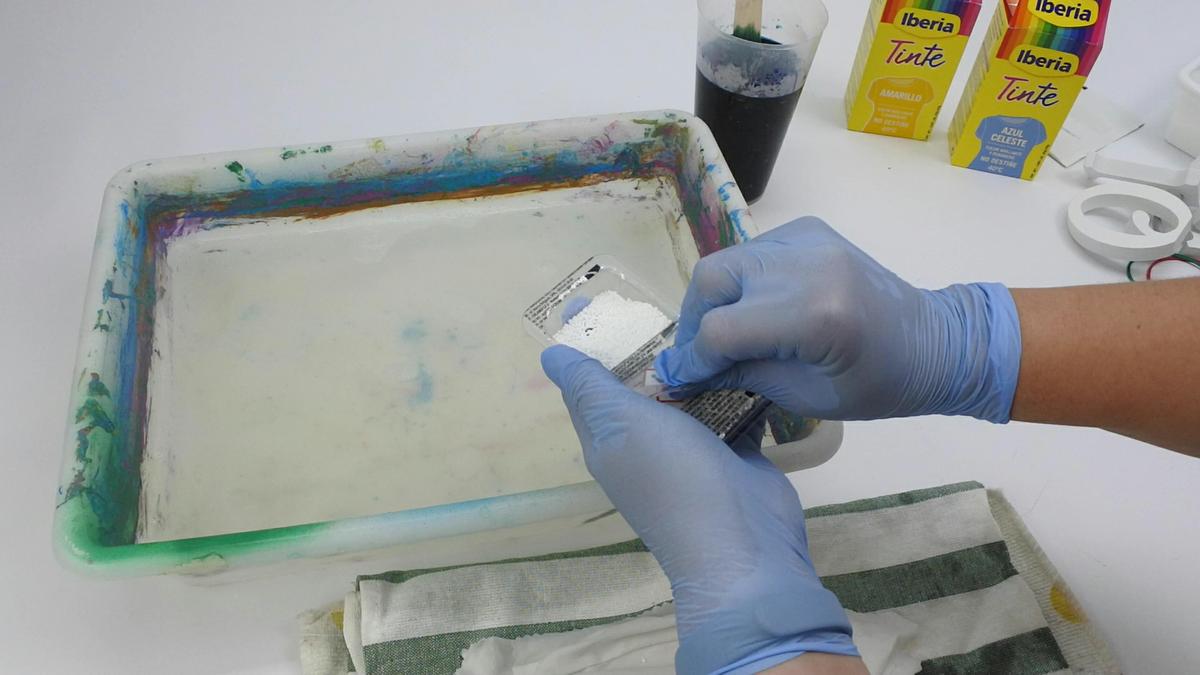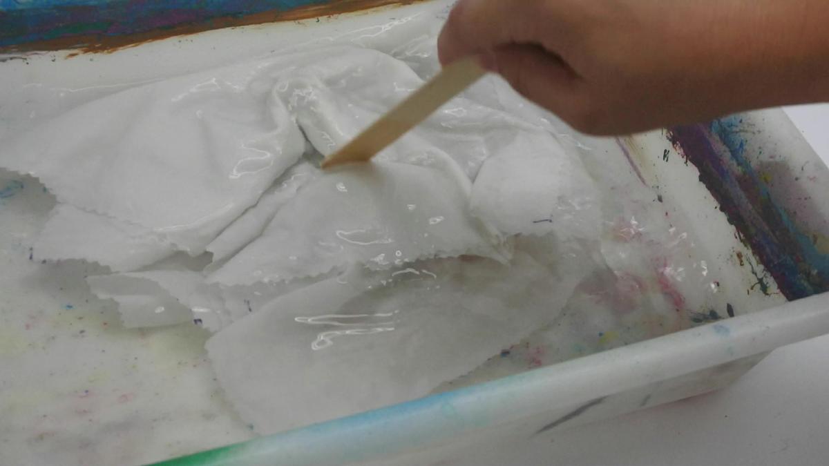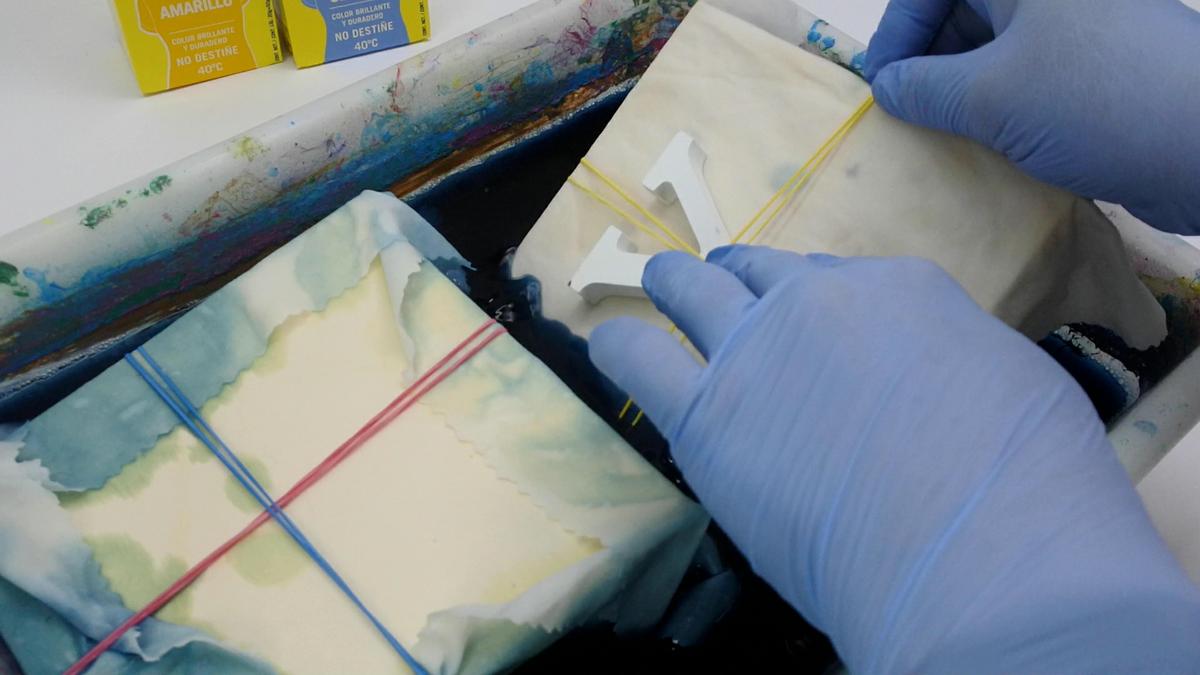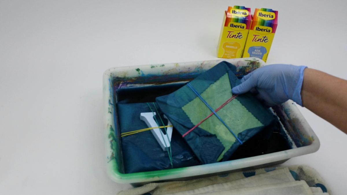 En este caso, podríamos introducir los trozos de tela tal cual o hacerles diferentes pliegues para que la tela nos quede marcada solo en algunas zonas o incluso para crear formas. Para ello podéis utilizar palos de madera, gomas elásticas, pinzas, la propia tela…