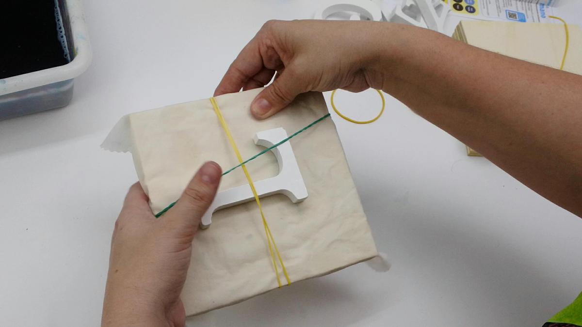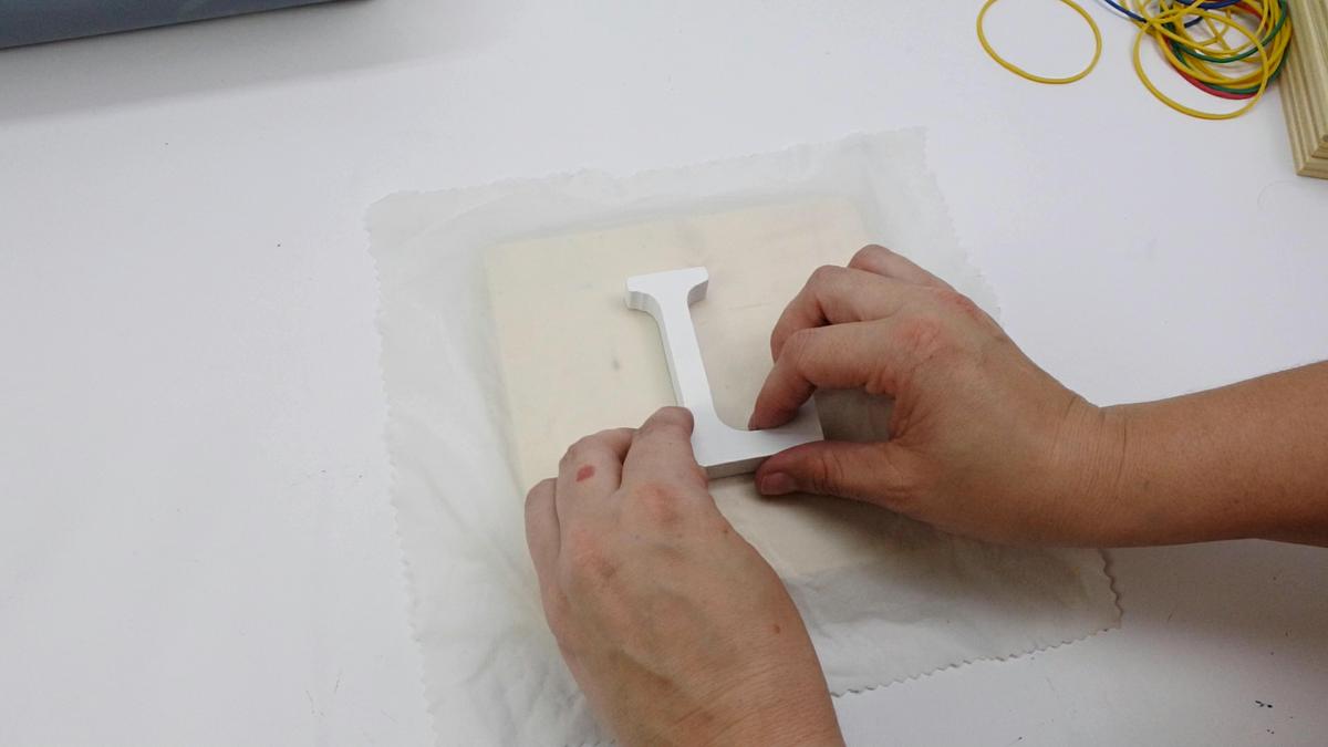 La tela que teníamos previamente reservada y humedecida con agua caliente la ponemos sobre la madera y sobre ella la letra que deseamos grabar. Es importante que lo sujetemos todo bien con las gomas elásticas ya que si la letra se mueve puede que no quede bien definida.