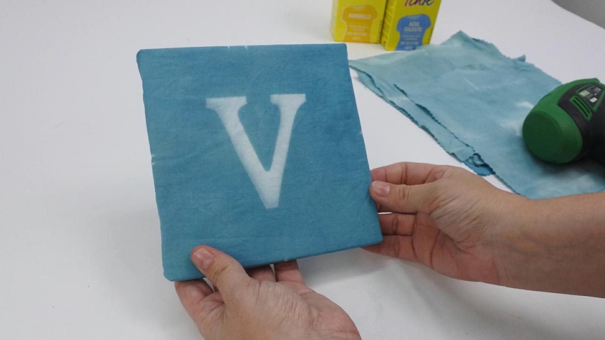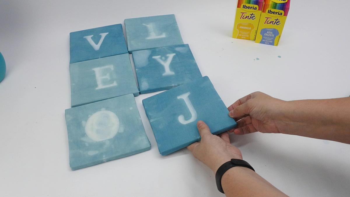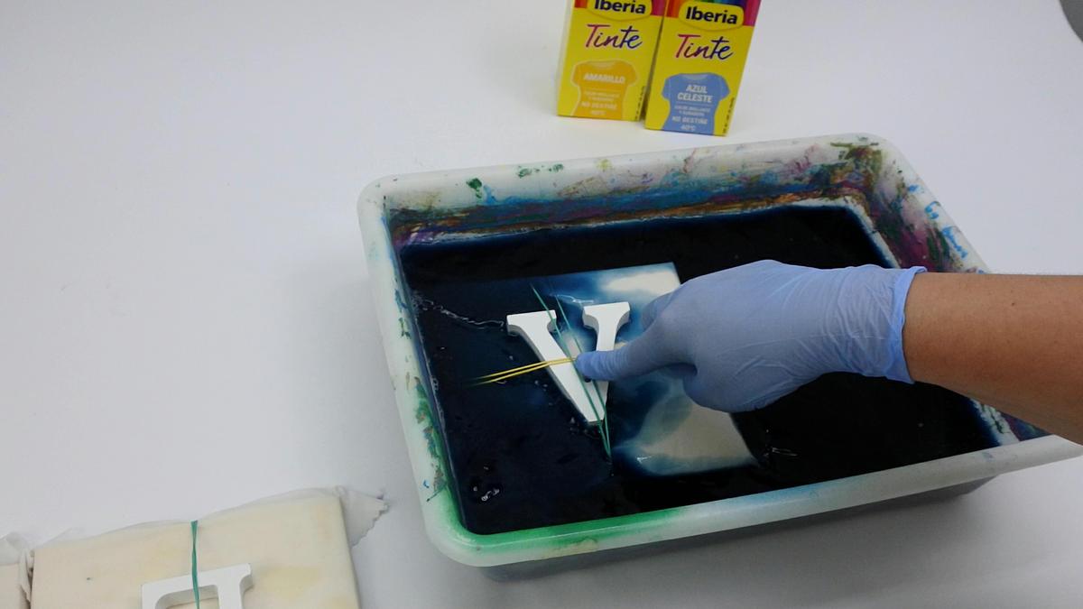 De este modo eliminaremos el sobrante de tinte. A continuación, es el momento de lavar nuestras letras. En nuestro caso los tintes nos llegaron junto con una botella de Norit (qué bien huele) que nos ha ayudado a que la tela quede genial