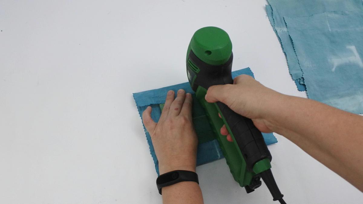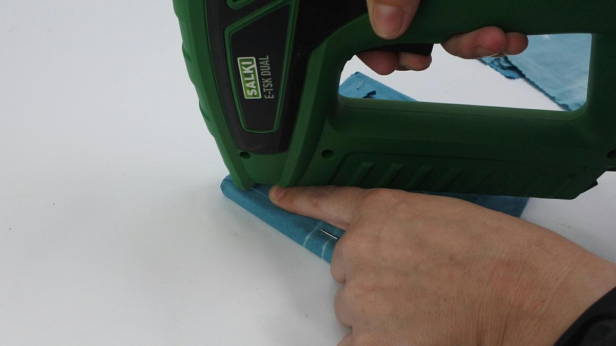 A continuación, y con la ayuda de la grapadora, fijamos la tela. Nosotros usamos la grapadora eléctrica de Salki. Nos encanta lo fácil que es grapar con ella y además nos ayuda a conseguir que quede tal y como queremos. Además, al ser eléctrica no tienes que hacer nada de fuerza.