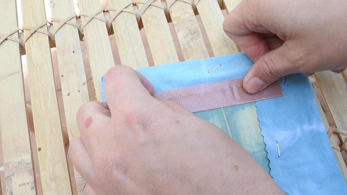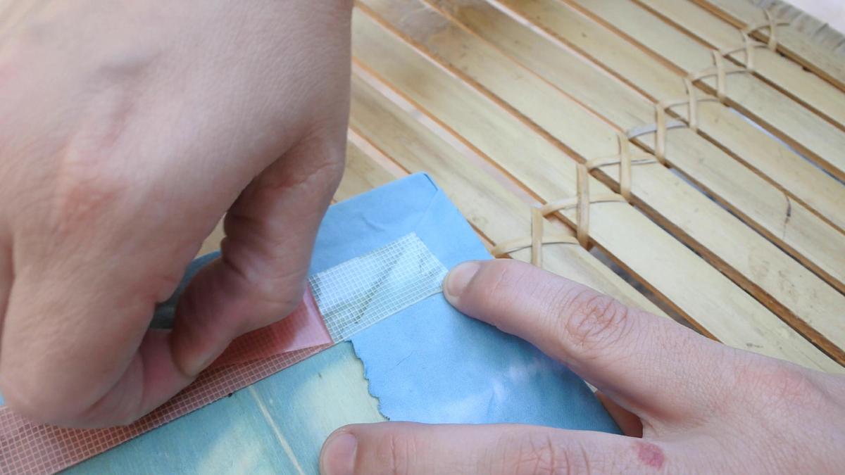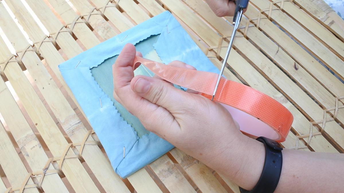 Una vez tenemos nuestros trozos de tela tintados y secos, ya solo queda darle forma. Para ello vamos a utilizar de nuevo las maderas que usamos previamente para tintar.