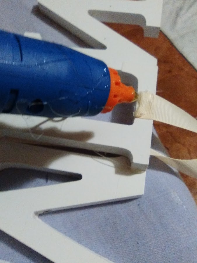 las pegamos con silicona y cojemos la cinta de raso que la pegaremos por la parte de atras de nuestras letras de forma equilibrada, osea,.. que los estremos esten a la misma distancia los dos
