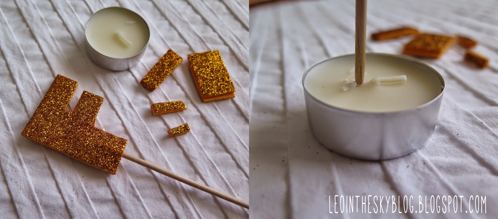 Materiales: una plancha de goma eva adhesiva en color oro con purpurina, velas de té, tijeras y palitos de brocheta de distintos tamaños.