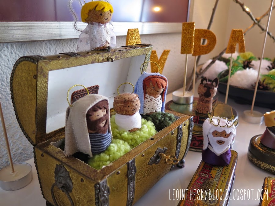 Eso sí, en cuanto saqué el belén de corchos sabía que me apetecía ponerlo en otro sitio y de una manera diferente a la del año pasado y en seguida se me ocurrió ponerlo en la entrada para que todo el mundo que llegue a casa pueda verlo. Aproveché mi colección de cajitas de metal para apoyar cada figurita y el cofrecito dorado como portal, pero me parecía que le faltaba algo, un toque de dorado brilli-brilli que me gusta tanto últimamente...y esto es lo que se me ha ocurrido: