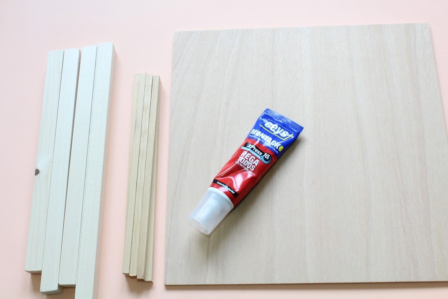 1 PASO: Montaremos el marco exterior, lo primero que haremos sera medir el cuadrado y cortar las maderas a la medida. Una vez tengamos los listones cortados a la medida los pegaremos a la base con Montack.