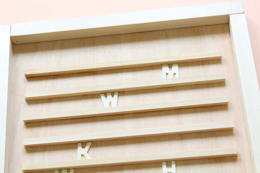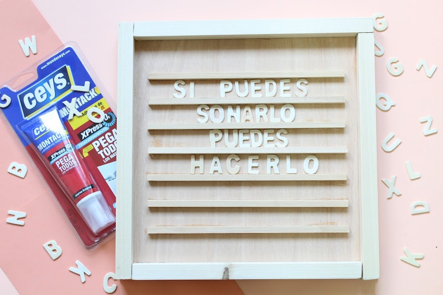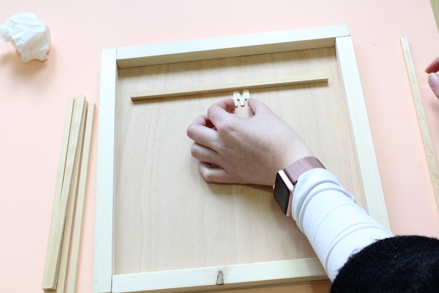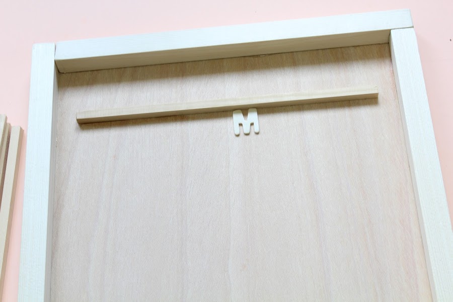 Para pegar el resto de listones, tendremos que tener en cuenta las medidas de las letras de madera que tengamos. Truquillo : ir poniendo las letras debajo de cada uno de los listones así los pegaremos a la medida correcta.