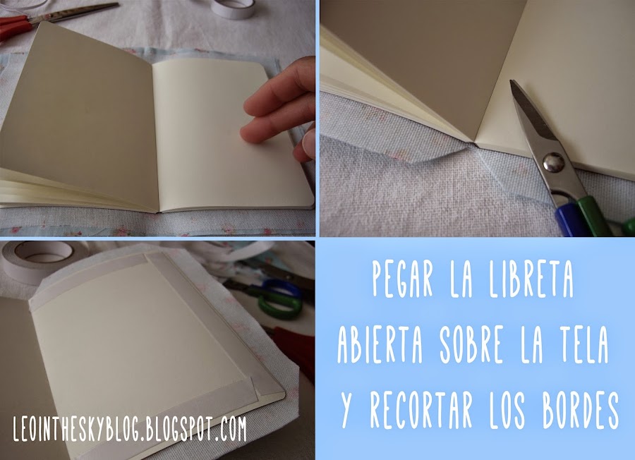 Es importante que al pegar la libreta a la tela lo hagamos con ésta abierta por la mitad, y no poner cinta adhesiva en el canto de la misma, de esta forma no tirará la tela cuando abramos y cerremos la libreta.