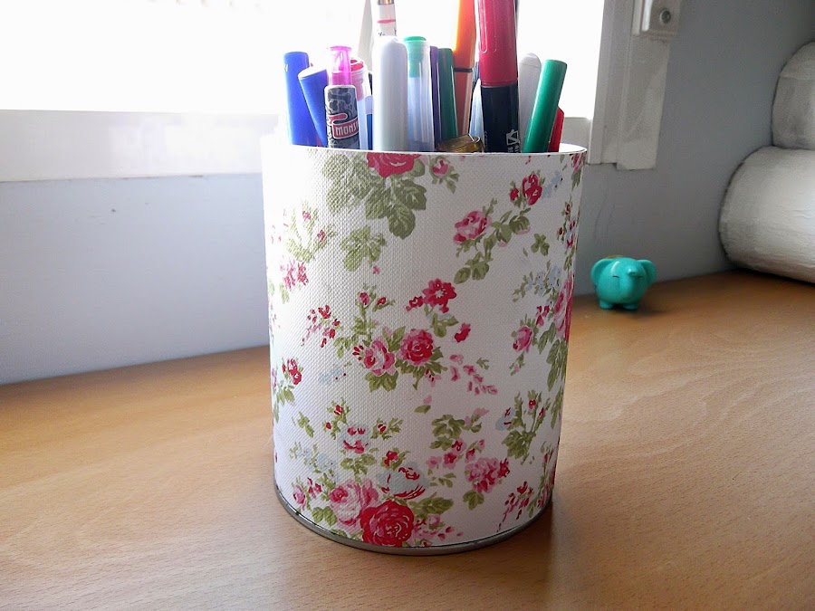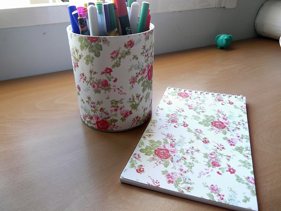 Además, hace tiempo utilicé este mismo papel para forrar una lata de conservas, y poder utilizarla de lapicero. También puedes ver un trocito de mi nuevo taller que tengo en marcha. ¡En cuanto lo tenga terminado te lo enseño!