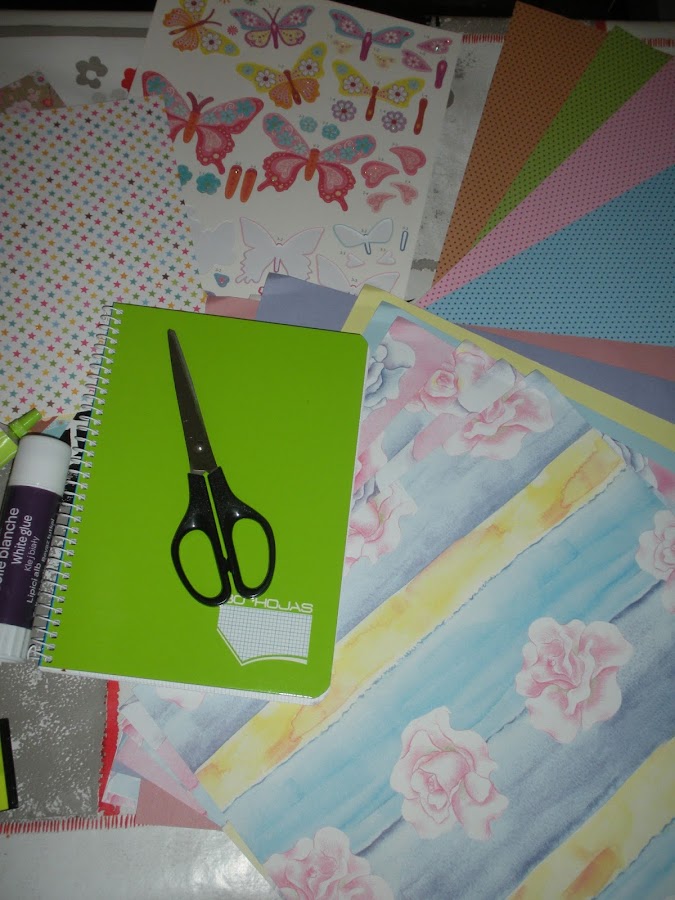 Para ello sólo necesitáis una libreta, pegamento, pegatinas, tijeras, rotuladores y papeles o cartulinas de diferentes colores y estampados.