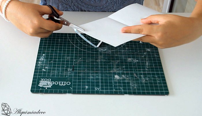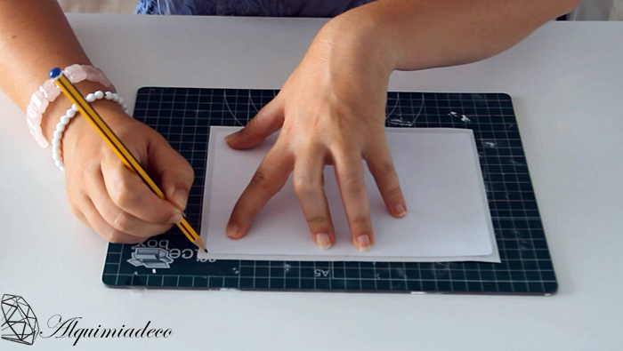 Una vez tengamos nuestra cartulina doblada, cogeremos nuestro folio impreso y lo doblaremos por la mitad. Yo he decidido redondearle las esquinas, por eso, he colocado mi plantilla encima y con la ayuda de un lapiz la he reseguido. Después he cortado lo que me ha sobrado.