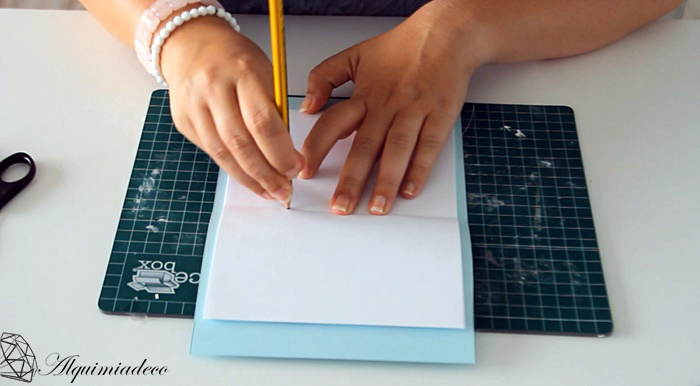 Ahora con la ayuda de la aguja, hacemos dos orificios en el dobladillo del papel, cuando lo tengamos listo, los colocamos encima de nuestra cartulina y hacemos lo mismo, los marcamos con el lapiz y los agujereamos.