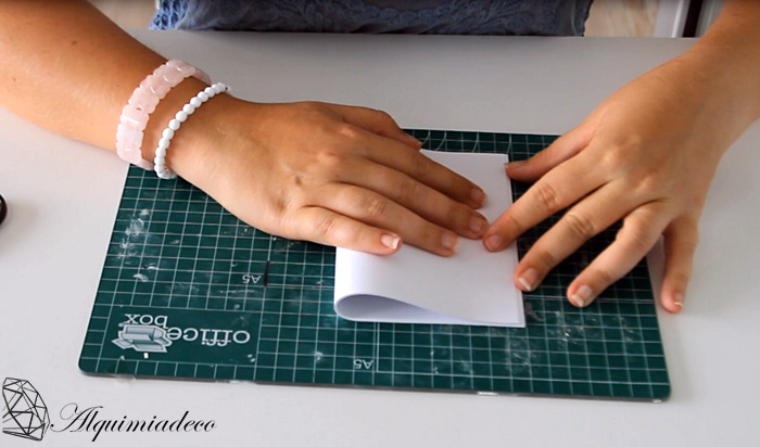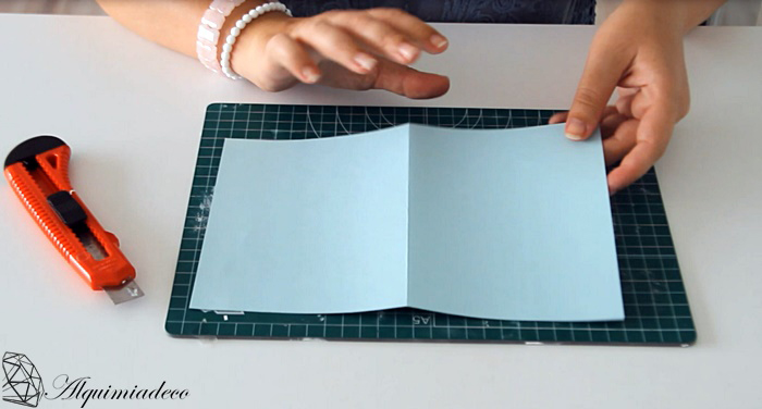 Lo primero que tenemos que hacer es doblar nuestra cartulina por la mitad y cortarla para conseguir nuestro tamaño deseado. Después la volvemos a doblar y ya nos queda el tamaño de nuestra libreta.