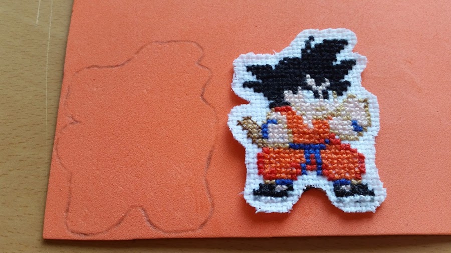 Cuando haya secado, solo nos queda unirlo. Si tienes un solo diseño (como el que ves aquí), elegimos lo que será la parte trasera. Yo he utilizado goma eva en color naranja.