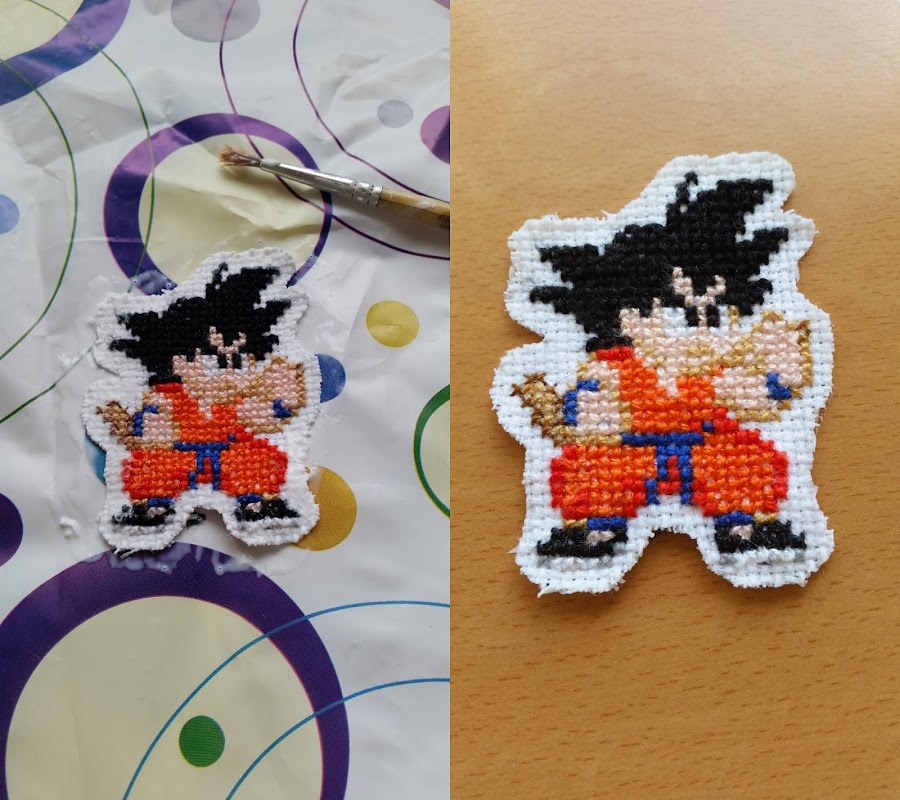 Una vez lo tenemos hecho, lo cortamos dejando un margen de uno o dos cuadritos de la tela, y encolamos el borde. Esto se hace para que, una vez seca la cola, queda duro y no se deshilachará. Además queda más uniforme.