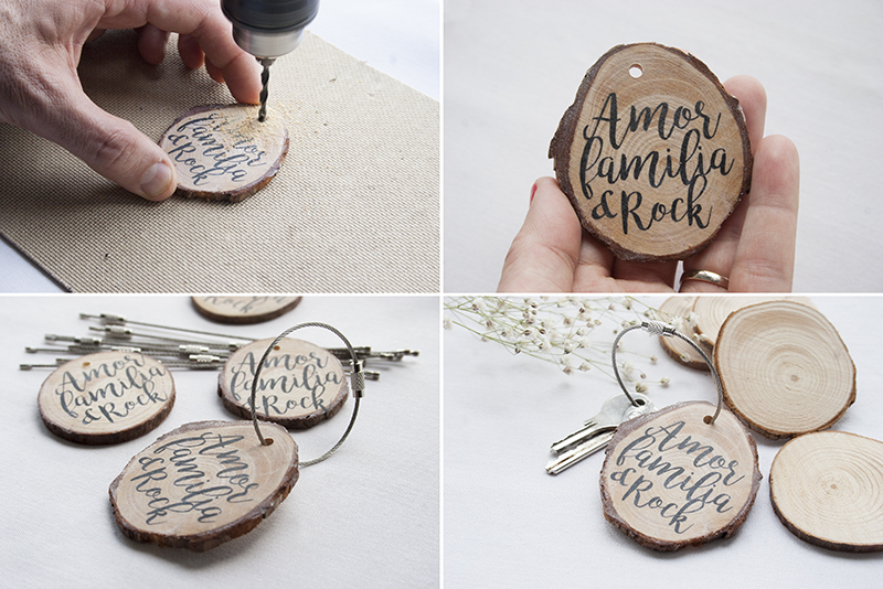 El siguiente paso lo haremos los mayores, haciendo un orifico con el taladro, y acabando por unir el alambre de acero inoxidable a las rodajas de madera personalizadas ¡Ya lo tenemos!