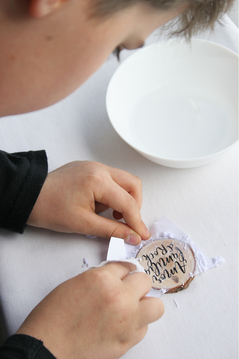 Es muy, muy fácil de hacer y a los peques les hace mucha ilusión ver cómo bajo el papel se esconde la frase que ha quedado bien pegada en la madera... ¡Parece magia!